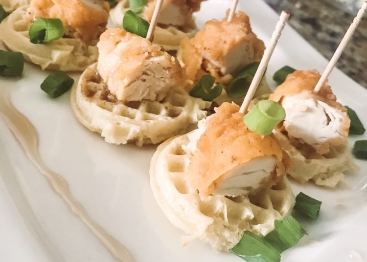 Party planning is a huge passion of mine. I love picking themes and sorting out all the details that go into making an event fabulous! One thing that usually overwhelms me though is the menu. Finding that balance between having somethings catered and somethings cooked at home can be tricky and can quite frankly take a few parties to nail down! Finding the short cuts is KEY! THESE quick and easy Chicken and Waffle Party Bites are effortless and delicious!